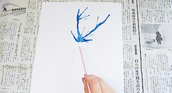 多めの水でといた絵の具を台紙にたっぷり流し、ストローで吹く。