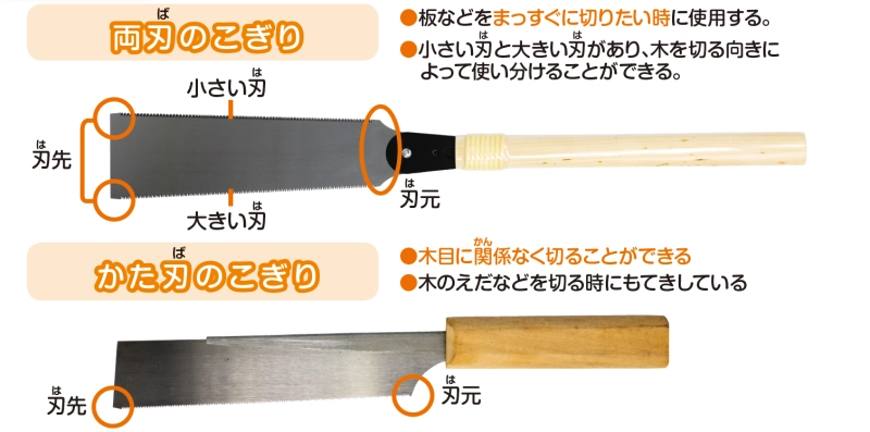 両端どちらも切れる「両刃のこぎり」と、片方だけ刃がついている「片刃のこぎり」があります。