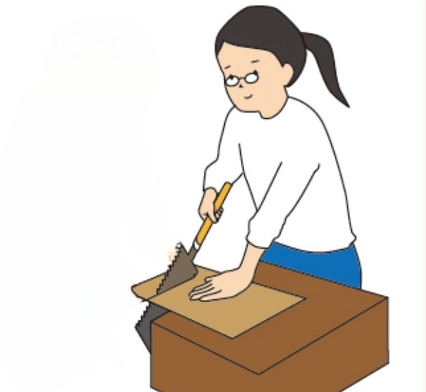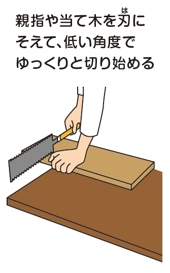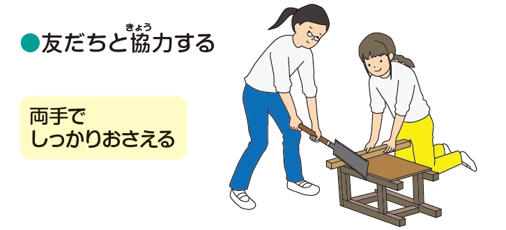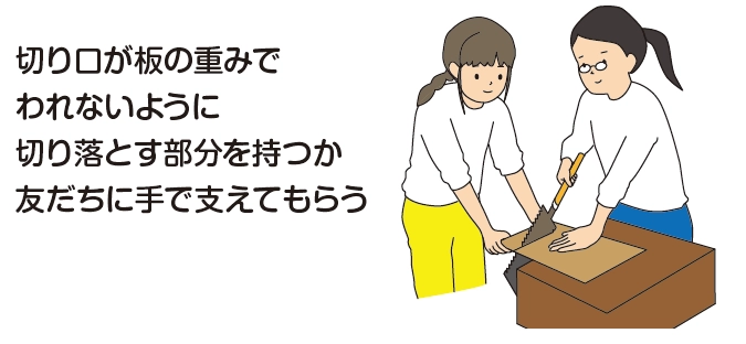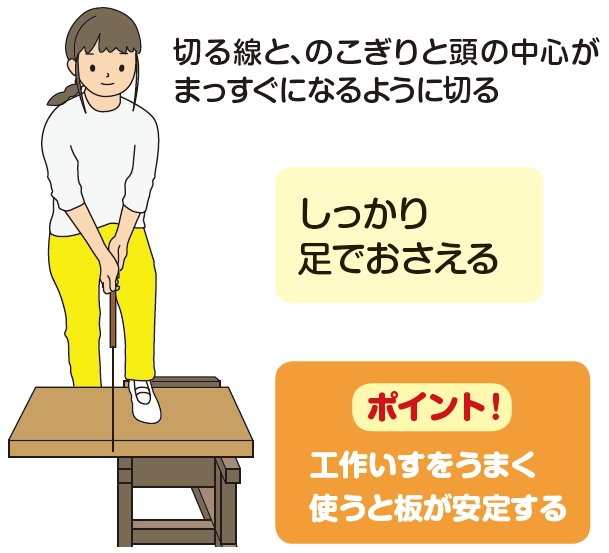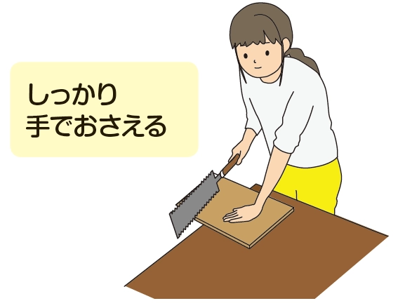 のこぎりを持っていない方の手で、板をしっかりおさえましょう!