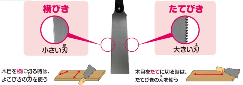 木目を横に切る時:横びき(小さい刃)