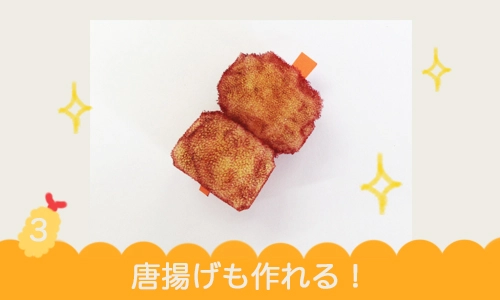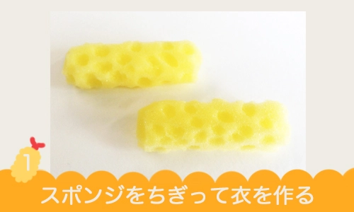 1.カラースポンジを細長く切り、指でちぎって衣を作ります。