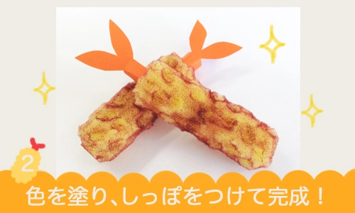 2.茶色の油性マーカーで表面を塗り、オレンジのカラー造形紙で海老の尻尾を作り、ボンドで貼り付けます。 カラッと揚げたてのエビフライが完成です☆