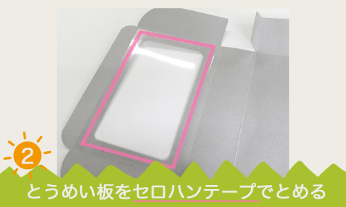 2.透明板をセロハンテープでしっかりはりつけましょう。 透明板を貼り付けたら、マーカーや絵の具を使って、お弁当箱を好きな柄にデコレーションしましょう。 (もちろんキットの紙や毛糸などを使ってもOK!)