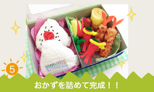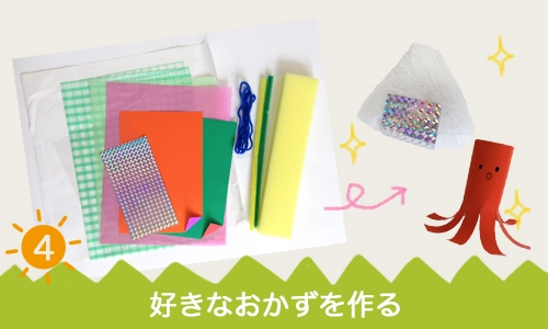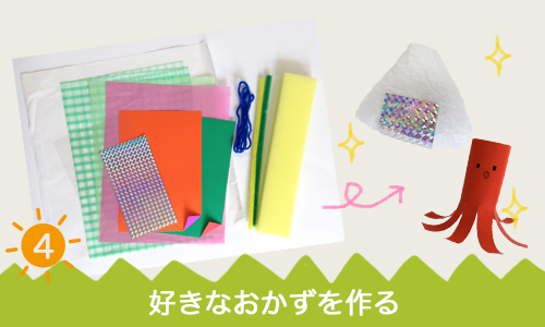 4.キットに入っているカラー造形紙やカラースポンジなどを使い、好きなおかずを作ってお弁当箱に詰めこみましょう!