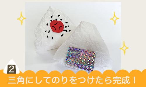 2.ティッシュを包みながら三角にして、のりや梅干しをつけたら完成☆ (のりはプリズムシートで、梅干しは赤色のカラー造形紙とくろ色のマーカーで作りました。)