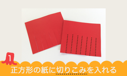 1.赤色のカラー造形紙を四角に切り、はさみで下半分に切りこみを入れます。
