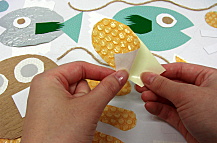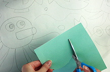 ②台紙の下絵の上にカットした模様紙を置き、 手や足などの動きが出るように調整します。