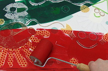 ④ローラーで版用台紙にインキをつけ、 その上に刷り取り和紙を重ねます。