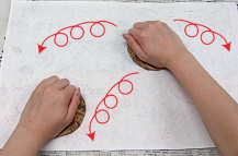 ⑤バレンで円を描くように強くこすり、 インキを和紙に刷り取ります。 毛糸やプッチンマット部分は手でなじませましょう。