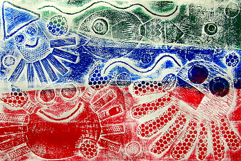 ⑥今回は3色のインキで、思い切って大きく塗り分けてみました。 下絵のイメージから大きく飛躍するような、迫力満点の作品が完成しました。 黒インキだけで刷った作品と見比べてみてください。