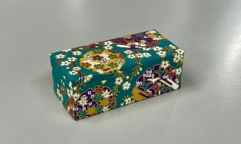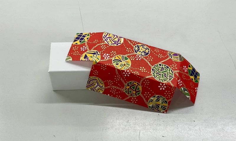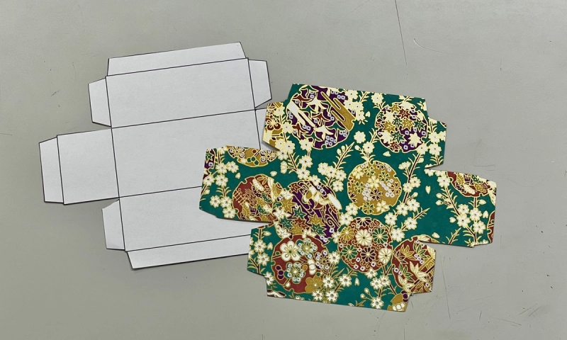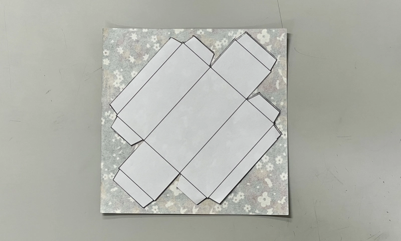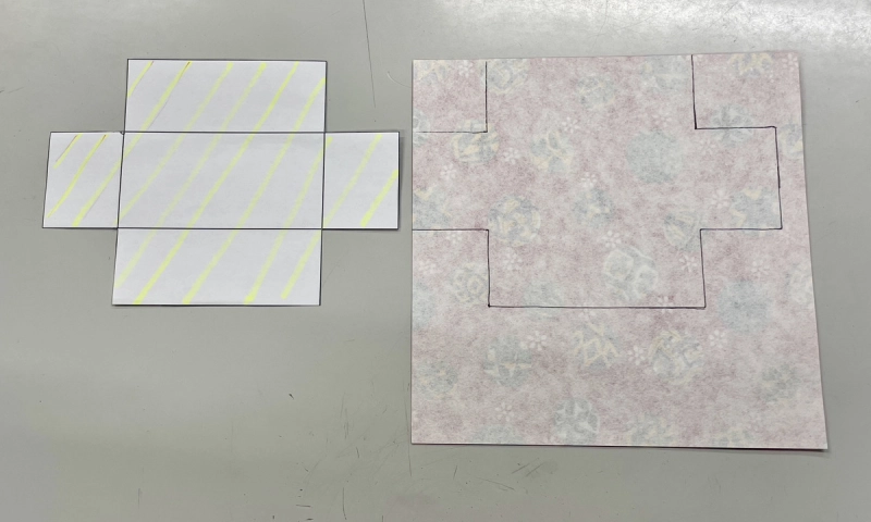 - 型紙を線の通りに切って千代紙の裏面に型紙通りに線を引く