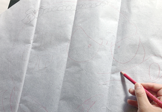 たこ本体とシッポシートに描く絵が決まったら、えんぴつで下書きをします。 ※たこ本体の描く面はザラザラの面の方になります。(ツルツルの面、竹棒が見える方が裏になります。) ※シッポシートはシールがある方が表面になります。(シールがある方を上にして下書きをしていきます。)