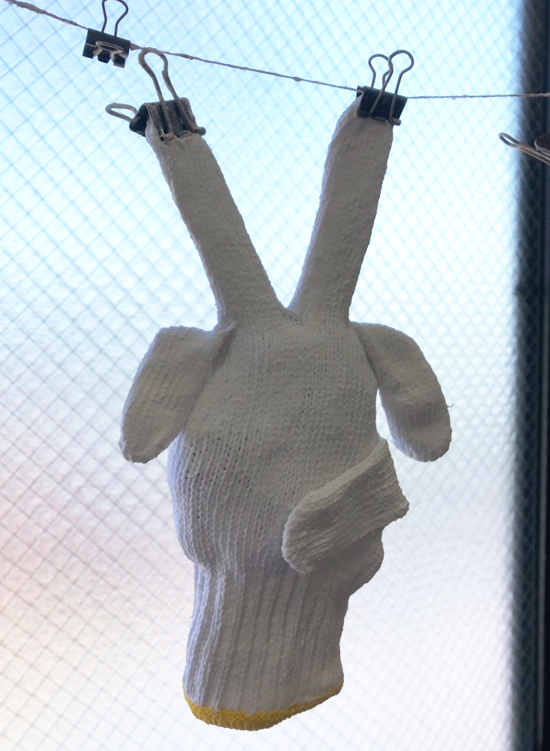 新聞紙やシュレッダーのゴミ、ペットボトル、水風船のような小さい風船を軍手の中に入れて形を作る。