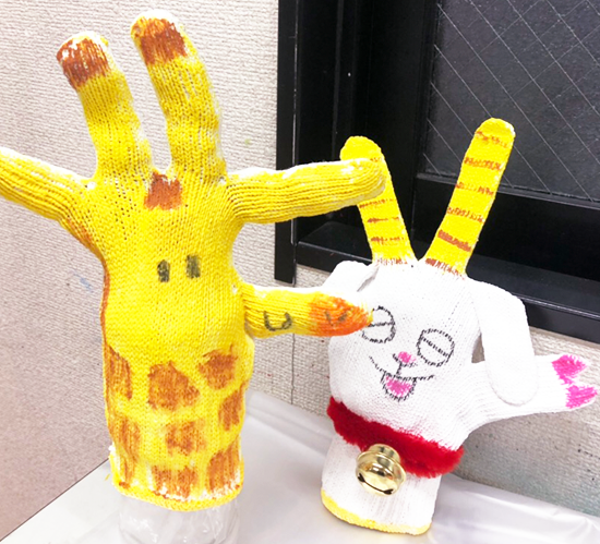 今回はモールと鈴を使ってヤギの首輪を作ったり、 軽量紙粘土Kクレイを使って飾り付けを行ったりしました。 軍手を2つ使用して手をつないだような形も作ってみました!