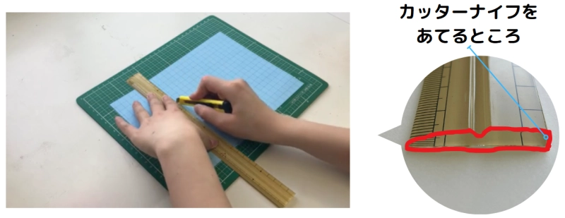 →定規をあてて切る ★目盛りが無い方にそわせると安定します!