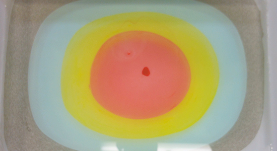 水溶液の上に絵の具を落とすと、ゆっくり絵の具が広がります