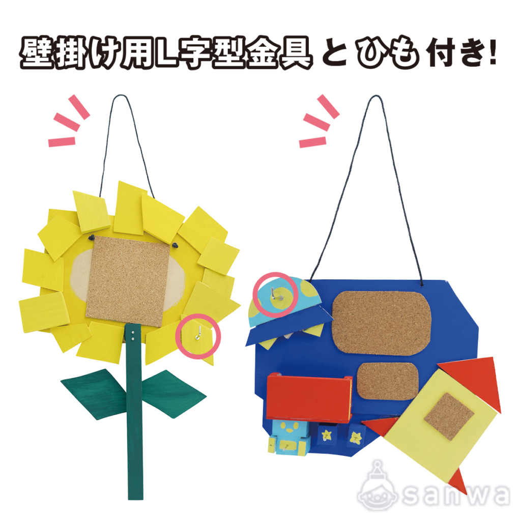 壁掛け用のL字型金具とひも付き!