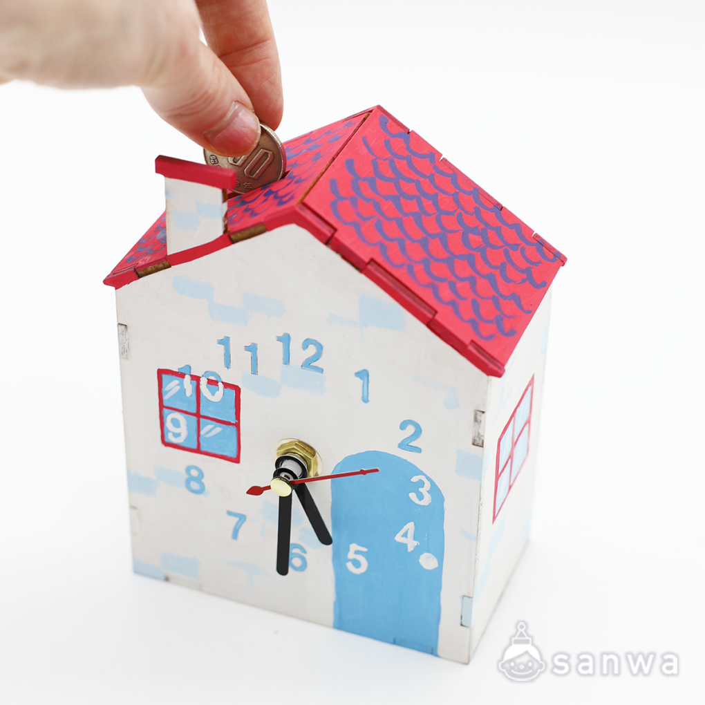 屋根から硬貨を入れて、時計にもなる可愛いおうち形の貯金箱簡単工作キットです。