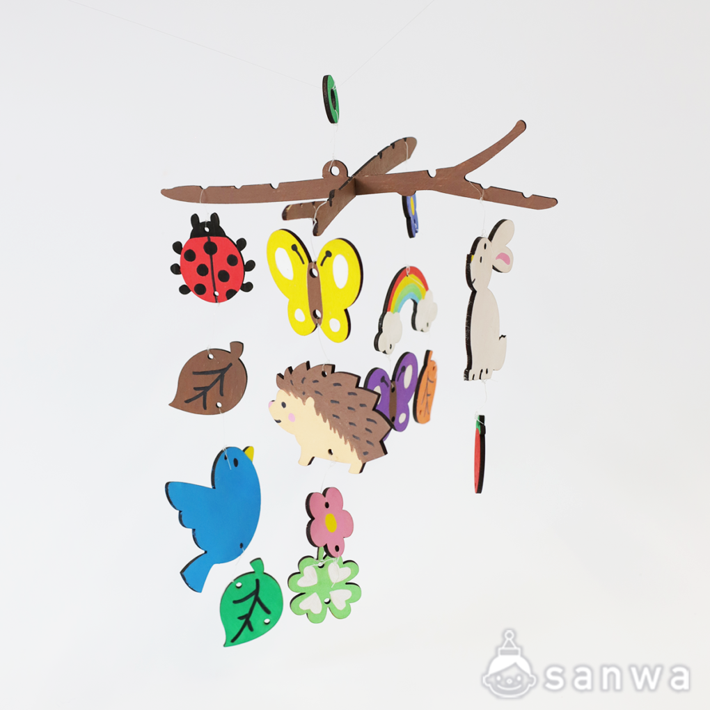 『木のモビール もりのいきもの』は、塗って紐を結ぶだけで森の生き物のモビールが作れて飾れる工作キットです。